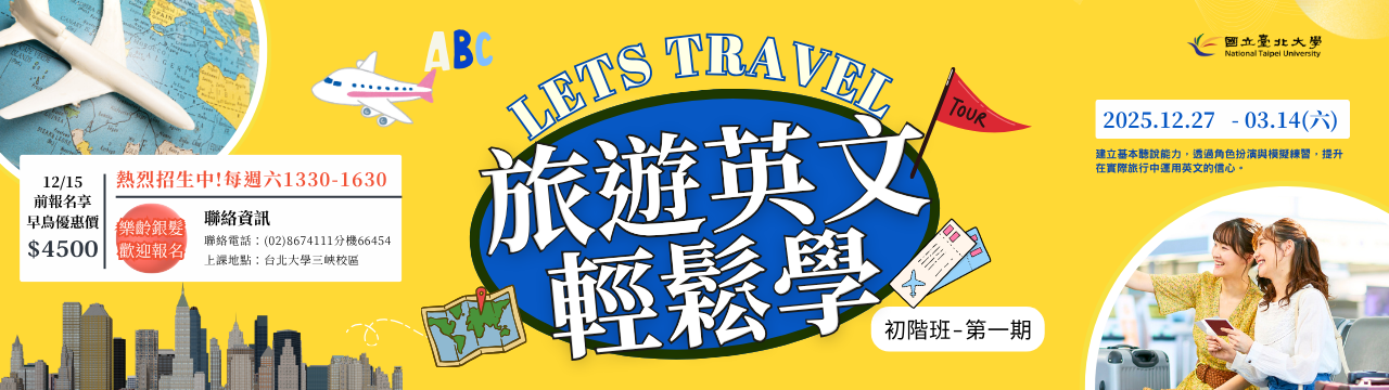 透過課程建立基本聽說能力,提升旅行中運用英文的信心,內容以實用情境對話為主,我們會帶你循序漸進的練習最常用、最道地的英語表達,讓你在輕鬆有趣的氛圍中開口說英語,不再害怕說錯,因此不論你是零基礎、久沒接觸英文,或是想加強口說能力的學員,都能找到適合自己的練習節奏,理解英文會話在不同場景所需詞彙和語句,讓你在出國時能自然開口、流暢溝通、享受旅程!不再比手畫腳,用英文自信開口說出你的世界!