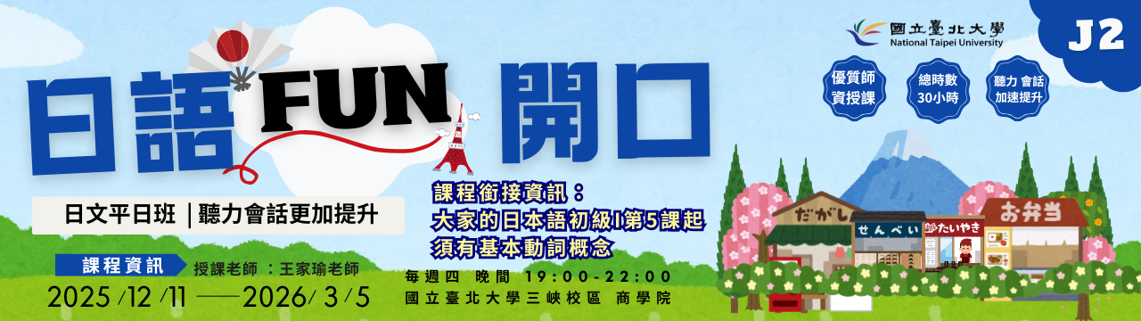 課程銜接資訊:大家的日本語初級I第5課開始,須有基本動詞概念。
