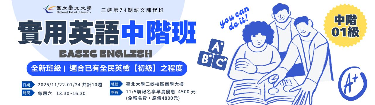 - 網路報名:至推廣組網站https://dce.ntpu.edu.tw/線上查詢課程並線上報名登錄個人資料。