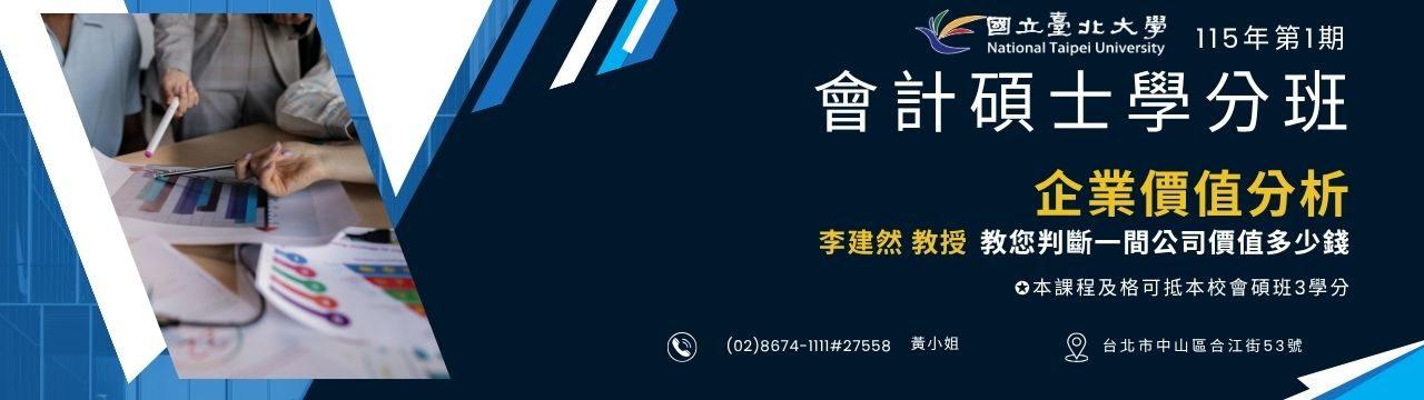 民國115年2月25日起會計碩士學分班始業授課,於晚間6:30-9:10上課。